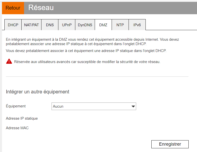 J'aimerais donc pouvoir mettre mon Proliant sous DMZ, donc comme sur la Livebox 5 je vais sur l'interface admin (192.168.1.1) onglet réseau et DMZ, et lorsque que je veux sélectionner mon équipement à mettre en DMZ je n'ai aucun équipement qui s'affiche, même pas mon PC perso, ni aucun de mes Raspberry d'ailleur.