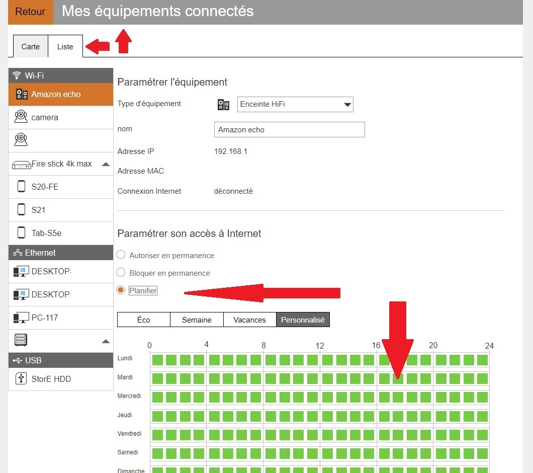 Sur une Livebox 5, comment autoriser/interdire l'accès au réseau en fonction de l'heure de la journée, de façon différente pour chaque périphérique ?