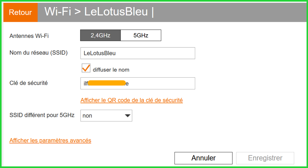 NB : Prends bien soin de masquer la clef ou les clefs de sécurité (si tu utilises des SSID différents), comme je l'ai fait ci dessus.