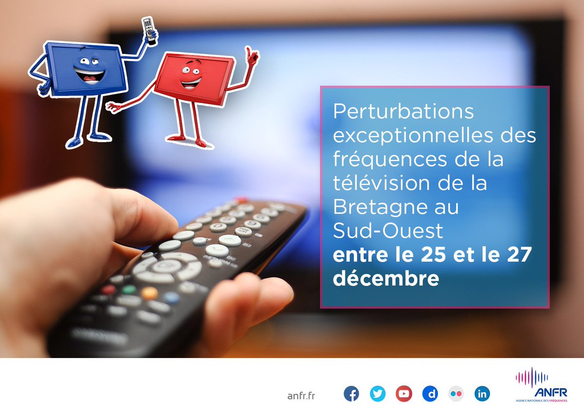 ⚠️📺 En raison d’un épisode météorologique particulier, de nombreuses communes de l’Ouest de la France risquent de rencontrer des difficultés de réception de la #TNT entre le 25 et le 27 décembre.