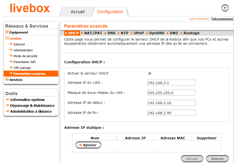 ETAPE 2 : Configuration côté Livebox ("Paramètres avancés" -> onglet "DHCP")