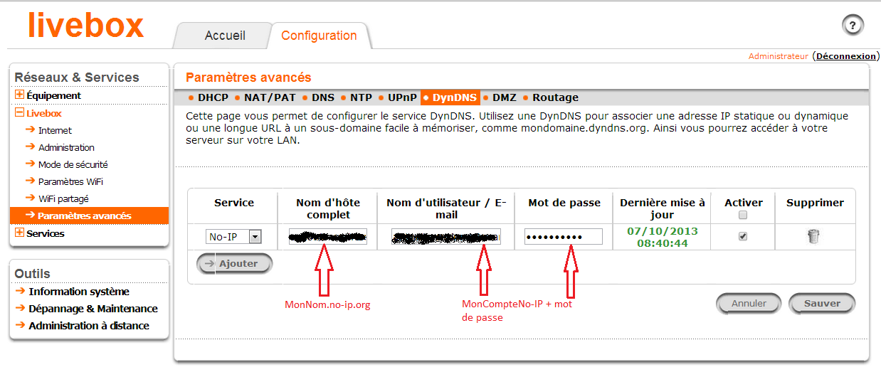 ETAPE 3 : Configuration côté Livebox ("Paramètres avancés", onglet "DynDNS")