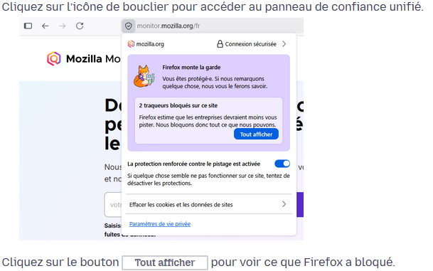 À partir de la version 149, l’ensemble des informations sont regroupées dans un seul panneau. Le bouclier dans la barre d’adresse prévient désormais de la sécurité du site. Pour en savoir plus :https://support.mozilla.org/fr/kb/protection-renforcee-contre-pistage-firefox-ordinateur#w_savoir-qu...