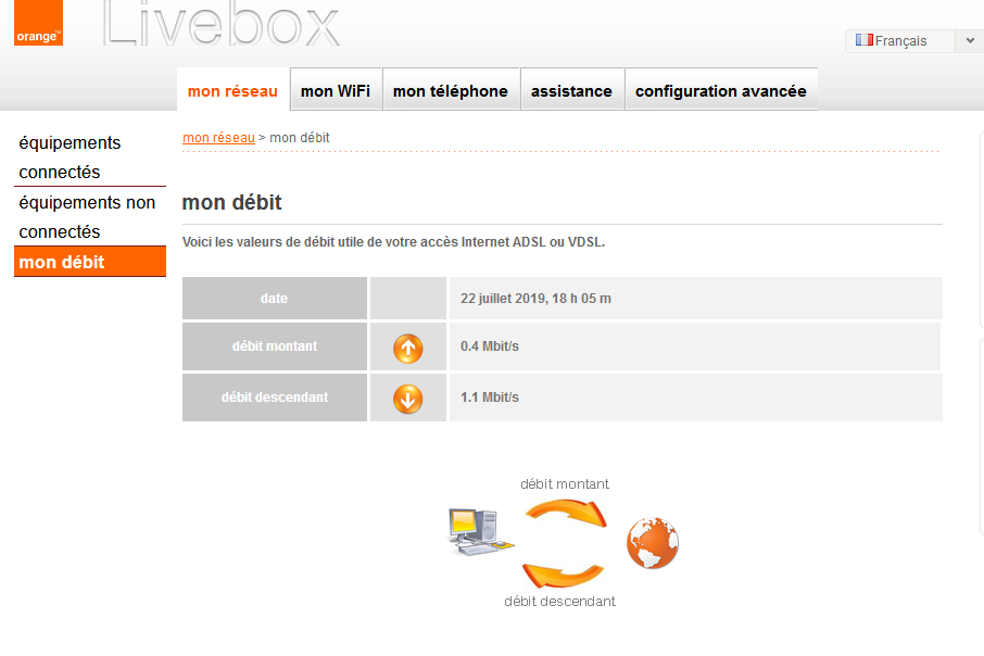 Donc, chaque année, de Septembre a Avril, je possède un "énorme" débit (Montant 1.2 // Descendant 4.5 au maxi), mais de Mars jusqu’à la fin de l'été ma livebox subit des déconnexions fréquentes toute les heures avec un débit qui se réduit énormément (Cf image ci-dessus). Chaque été le service client orange m’envoie un technicien qui me change mes filtres ADSL, mais je constate aucun changement.