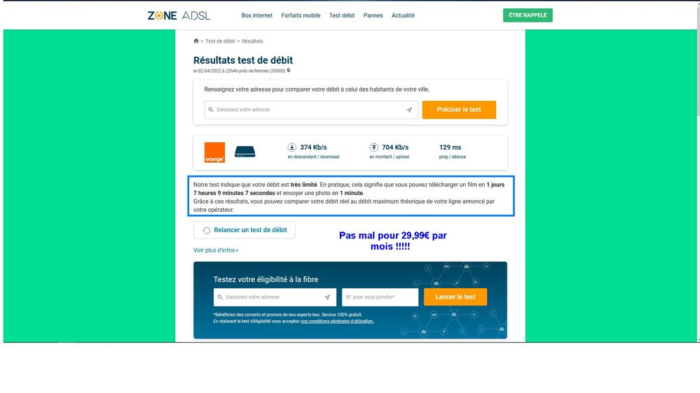 Je n'ai jamais dit que 300ko/s = 2,4Mb/s, je précise bien que je n'ai qu'en réception 300Ko/s soit 0.3Mbp/s à une certaine heure, la valeur de 2,4Mb/s est celle que "normalement" devrait être accordée à mon domicile et c'est loin d'être le cas.Le test est bien entendu réalisé en ethernet pour l'ensemble des sites dont celui d'orange (speedtest,zone adsl,degrouptest, ariase,mire,etc..) aucun intérêt en wifi ça serait pire et sans fondement compte tenu de la fluctuation encore plus importante.C'est vrai que notre domicile est en retrait mais les arguments d'orange sur les futures augmentations de débit ( depuis 15 ans réellement) et le fait qu'à une certaine époque il était le "leader" et sans concurrence réelle avait fait pencher la balance comme FAI mais c'était avant..Certes il faut prendre son mal en patience mais je pense que dans mon cas (comme beaucoup d'autres), la tarification internet , téléphone doit être proportionnée au débit réel et non dans un forfait dont nous sommes loin d'atteindre les " limites" maximales autorisées . Un autre petit point de vue plutôt d'aspect "administratif",je ne trouve pas normal qu'il n'y est aucune boite mail pour communiquer avec Orange, tant sur les problèmes rencontrés, les facturations (ça m'est arrivé plus d'une fois),les réclamations, etc...toujours un conseillé, trop souvent limité dans sa tâche et qui n'a aucun pouvoir de décision ni de réelles compétences dans ce domaine.Voilà....Je souhaitais simplement comme d'autres "clients" orange à travers mon "vécu" exprimer mon ressentit sur ce FAI, le futur choix sera sans doute au détriment de ce dernier...la fidélité n'est plus d'actualité.Cordialement