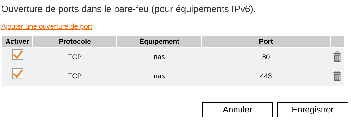 Pour accéder depuis l'extérieur à mon NAS en IPv6, je crée des règles d'ouverture de ports dans le pare-feu (pour équipements IPv6). Mais j'ai remarqué que ces règles sont automatiquement supprimées par la Livebox au bout de quelques jours ou de quelques semaines.