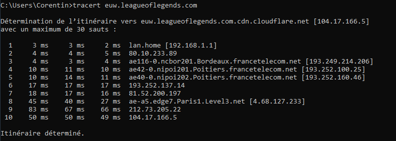 Voici un tracert vers les serveurs de jeux de League Of legends (EUW):