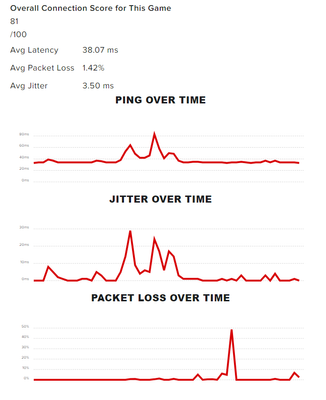 Et l'analyse par l'outil de Riot Games (l'éditeur du jeu), des connexions réseau pendant les parties, on distingue bien des packet loss durant ces 2 parties, qui se ressentent donc en plein jeu: