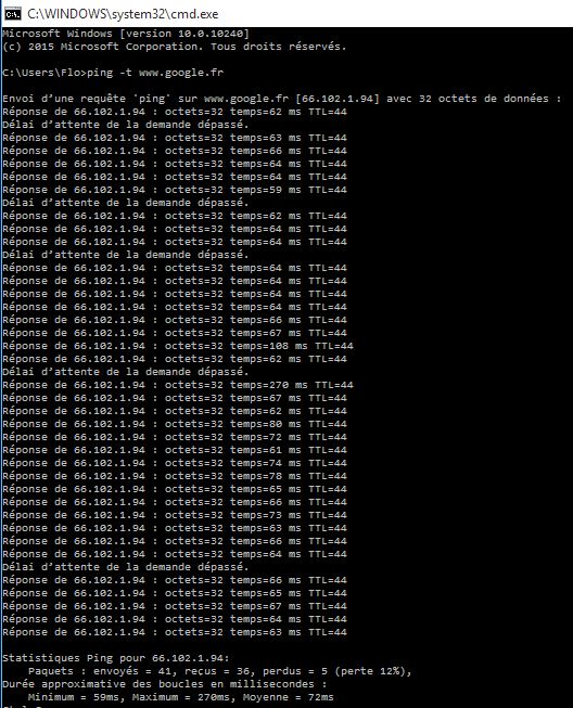 Ma machine est sous Win 10 en Wifi, à jour (déja testé sur mon portable Win 7 en ethernet et même problème). En effectuant un ping vers google je m'aperçois qu'il y a quand même pas mal de perte :