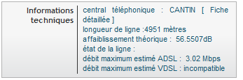 Caractéristiques générales de la ligne : Etat de la ligne : Code Commutateur Local : Nom Commutateur Local : Longueur de ligne : Distribution directe Paires disponibles Affaiblissement théorique : [Estimation] Débit descendant ADSL : [Estimation] Débit descendant ADSL 2+ : [Estimation] Débit descendant VDSL 2 : [Estimation] Débit montant VDSL 2 :