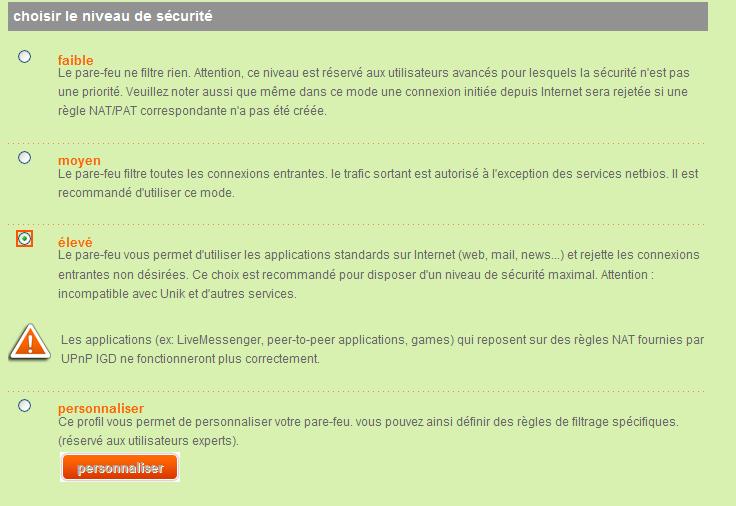 Car s'il est sur élévé: ' Les applications (ex: LiveMessenger, peer-to-peer applications, games) qui reposent sur des règles NAT fournies par UPnP IGD ne fonctionneront plus correctement."
