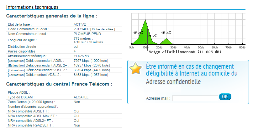Caractéristiques du central France Télécom : Plaque ADSL : Type de DSLAM : Zone Dense (> 20 000 lignes) : Nombre d'abonnés approximatif : NRA compatible ADSL FT : NRA compatible ADSL Max FT : NRA compatible ADSL2+ FT : NRA compatible ReADSL FT :