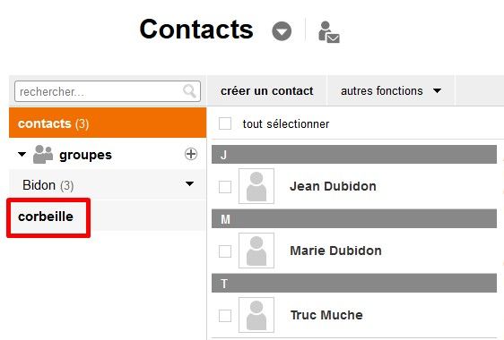 Contrairement à toute logique, la corbeille des contacts se trouve dans l'onglet "Contacts" de la messagerie !