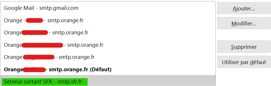Ça t'affiche la liste des serveurs sortants dont tu disposes. Chez moi il y en a un pour chacune de mes adresses. Chez toi il n'y en a sans doute qu'un seul marqué "(Défaut)" et dont l'adresse d'authentification est ton.adresse@orange.fr :