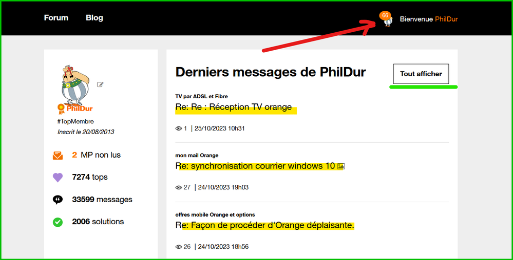 Tu peux afficher la liste de tous les messages que tu as postés en cliquant sur le bouton "Tout afficher"