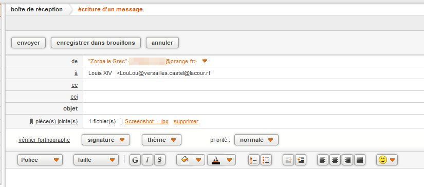 Là tu pourras tout simplement glisser/déplacer la pièce jointe dans le mail, l'envoi se fera de ton courrielleur au serveur SMTP directement sans passer par le portail Orange.