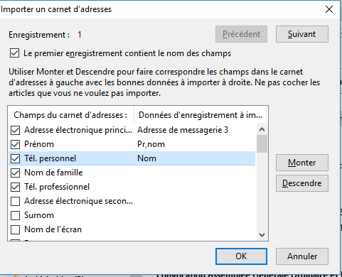 Dans le tuto, j'ai écrit : "Dans la fenêtre qui vient de s’ouvrir faites correspondre en montant ou en descendant les informations de la colonne de droite à celles de la colonne de gauche. Opérez dans l'ordre descendant de la colonne de droite. Quand vous avez terminé et que vous vous êtes assuré que toutes les cases des champs que vous souhaitez importer sont bien sélectionnées, cliquez sur OK puis sur Terminer."